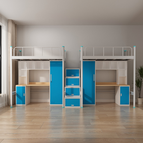 產品介紹:連體學生宿舍公寓床款式技術要求 一、鐵床部份的材質:(規(guī)格W6380*970*H2080mm) 1 立柱:采用優(yōu)質冷軋鋼板經特制成型線軋制而成,其立面為中空異形(方便雙面噴涂,不能用方管或圓管),立柱正面為斜邊形設計,起到防撞作用,并有4條加強筋,立面成型后尺寸為78mm*78mm,材料厚度為1 2mm